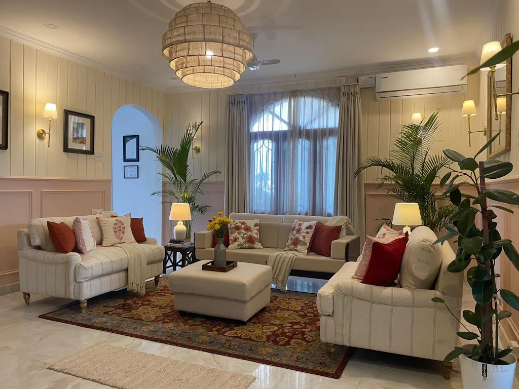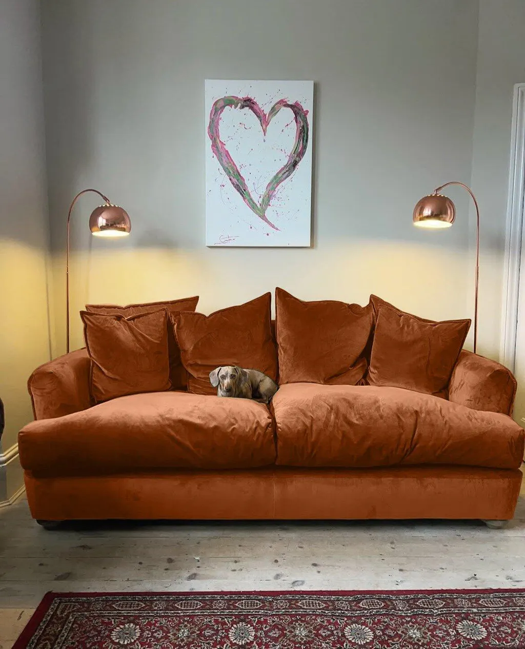 A little bit bigger than I expected. Turned out so pretty and is perfect for the space. My sofas were customised in a striped fabric.